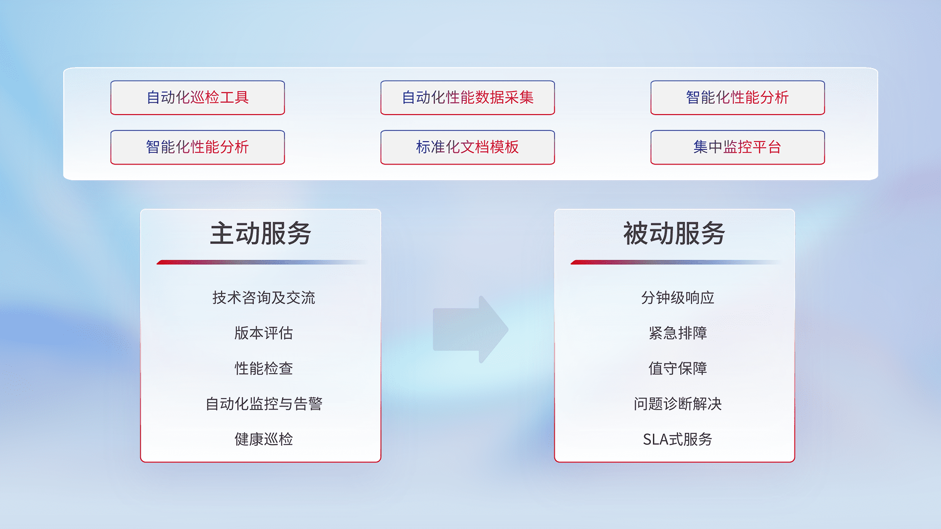 智能化工具和标准化文档,,保障服务质量,,,,提供主动服务(包含技术咨询、、版本评估、、性能检查、、、自动化监控与告警、、、健康巡检)和被动服务包含(分钟级响应、、、、紧急排障、、值守保障、、、问题诊断解决、、SLA服务)。。。。